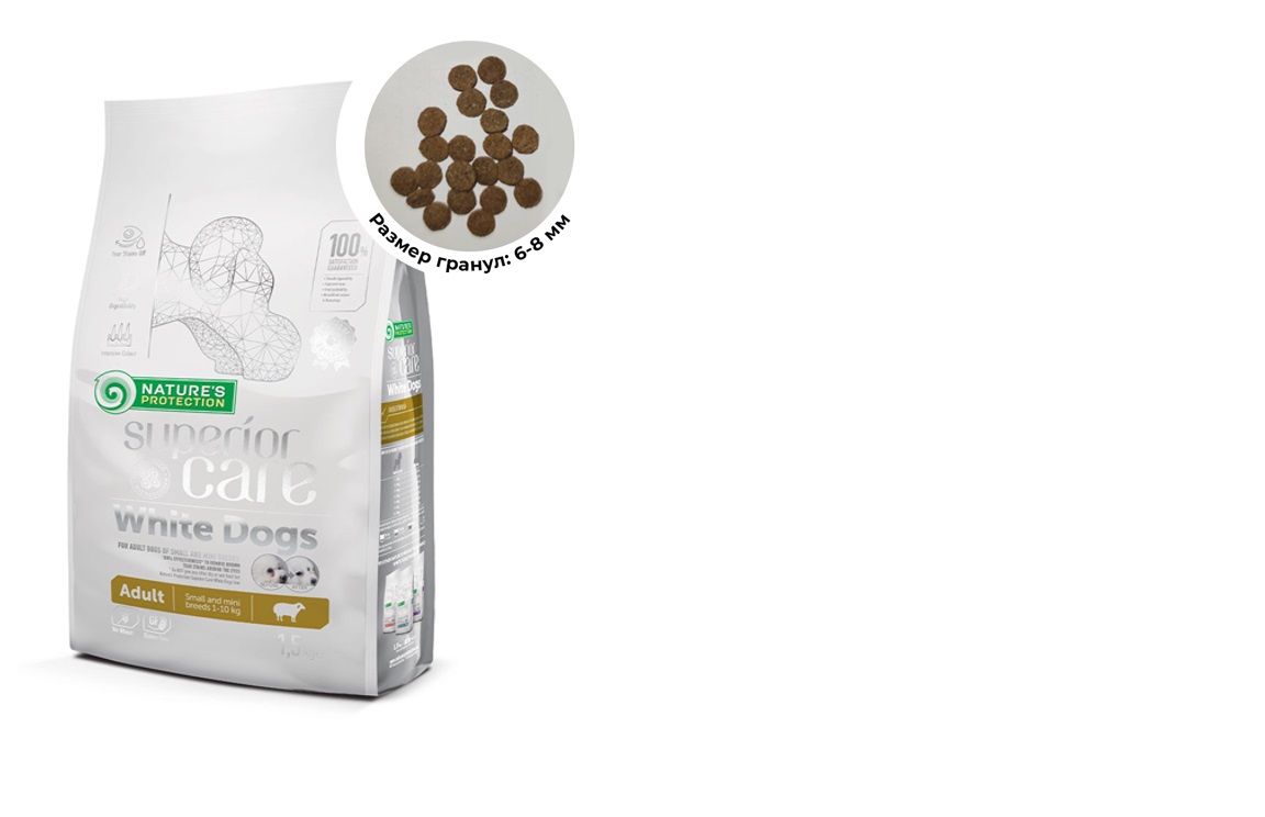 Сухой корм Nature’s Protection Superior Care White Dogs - полнорационное питание для взрослых собак средних, мелких и карликовых пород белого окраса в возрасте старше одного года (масса тела взрослой собаки 1-10 кг), с особыми потребностями в уходе за кожей и белой шерстью.